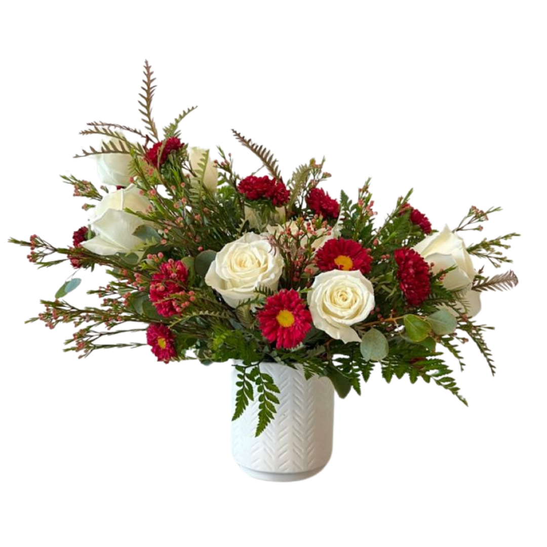 Bring holiday cheer to your home with our Jingle Blooms Fresh Flower Vase, a delightful arrangement of vibrant red and white flowers paired with lush greenery....