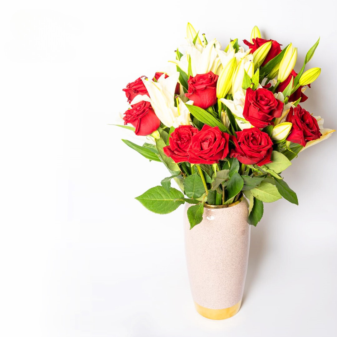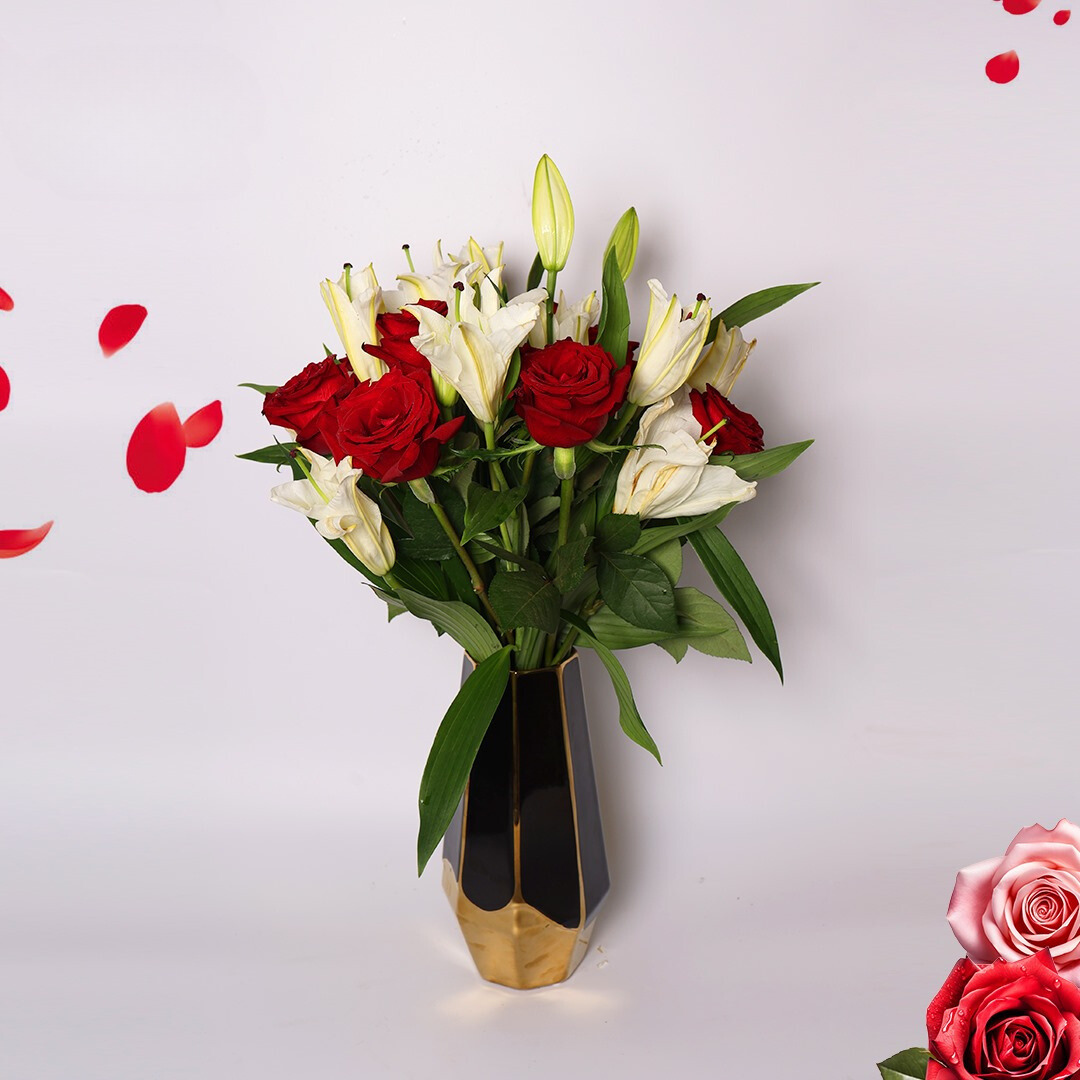 Heavenly Hues: Luxurious Bloom (Red Rose & White Lilies Centerpiece) Indulge in the luxurious charm of our Heavenly Hues: Luxurious Bloom centerpiece. This stunning arrangement combines...