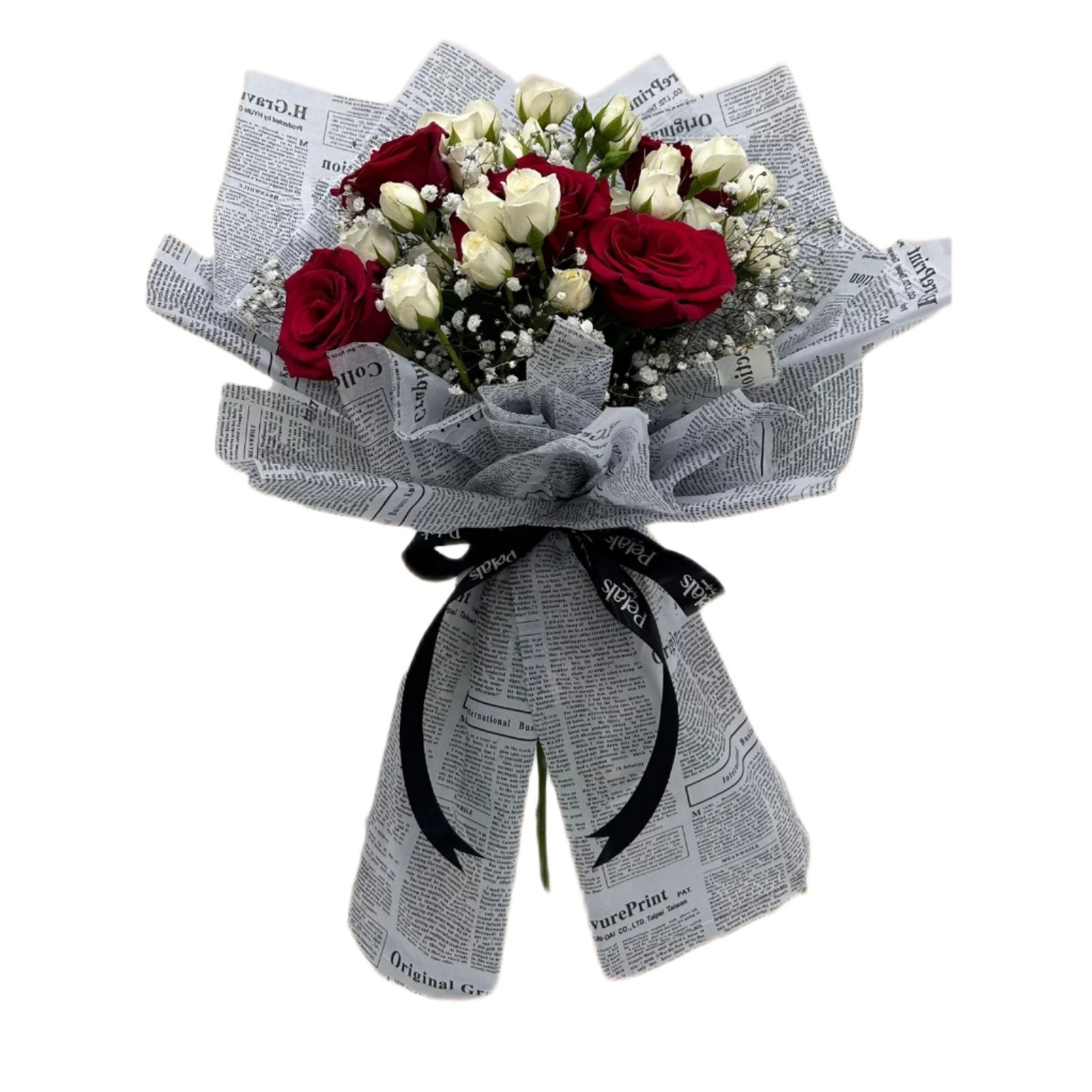 Delight in the vintage elegance of our Love in Headlines Bouquet, featuring 10 delicate baby white roses and 5 bold red bulb roses. Wrapped in a...